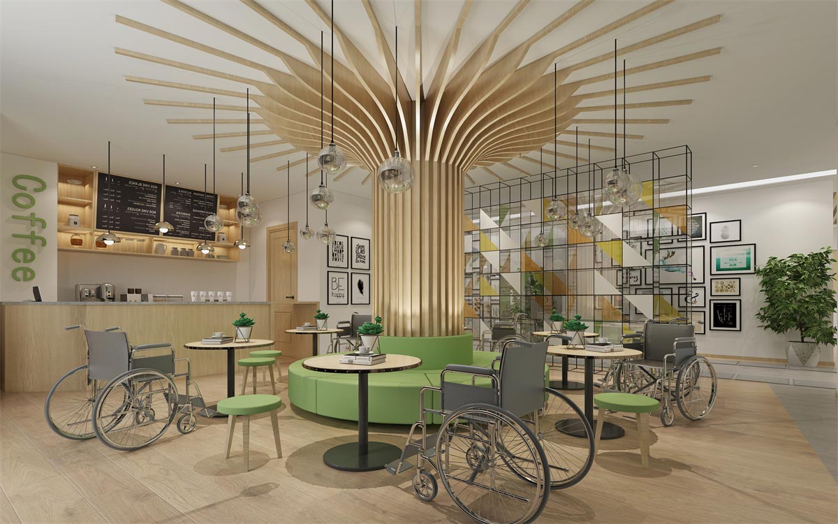 整個辦公室設(shè)計以關(guān)愛殘障人士為主題,采取綠色點綴,暖色為主的色彩搭配,表現(xiàn)辦公室溫馨而又充滿生機的辦公氛圍,從設(shè)計實景圖中可以看出,辦公環(huán)境表達對殘障人士的關(guān)懷和能力的認可與肯定。